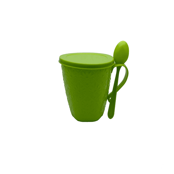 TAZA (POCILLO) CON TAPA Y CUCHARA EN MATERIAL PLÁSTICO Y COLORES SURTIDOS